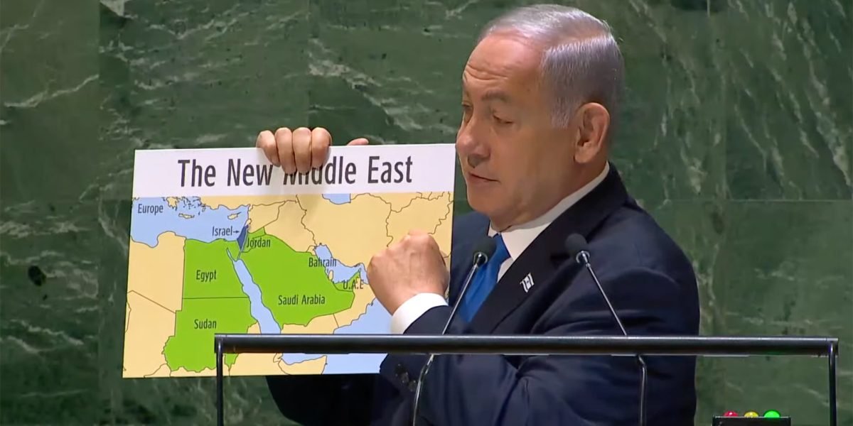 Netanyahu apresentou um mapa do Oriente Médio para mostrar o efeito do acordo com a Arábia Saudita.